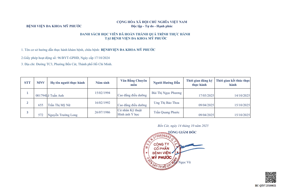 Danh sách học viên đã hoàn thành quá trình thực hành tại Bệnh viện Đa khoa Mỹ Phước